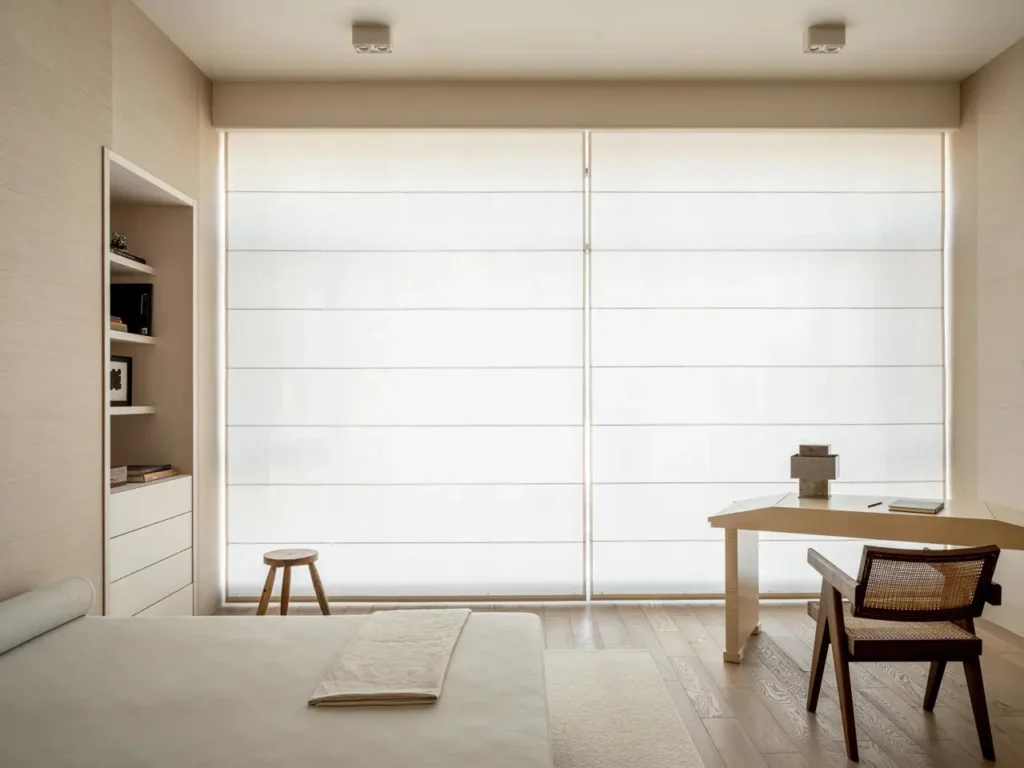 Estas cortinas romanas, también conocidas como estores enrollables, son tan delicadas como elegantes. El color sutil entre blanco y beige viene dado por la seda en la que están fabricadas. Combinadas con la madera del suelo, la textura del papel pintado en las paredes y los demás textiles, consiguen un espacio de ensueño. Inspírate y diseña un espacio minimalista y sobrio en tu propio hogar. La clave es definir un esquema monocromático que puedas expandir por toda la estancia.